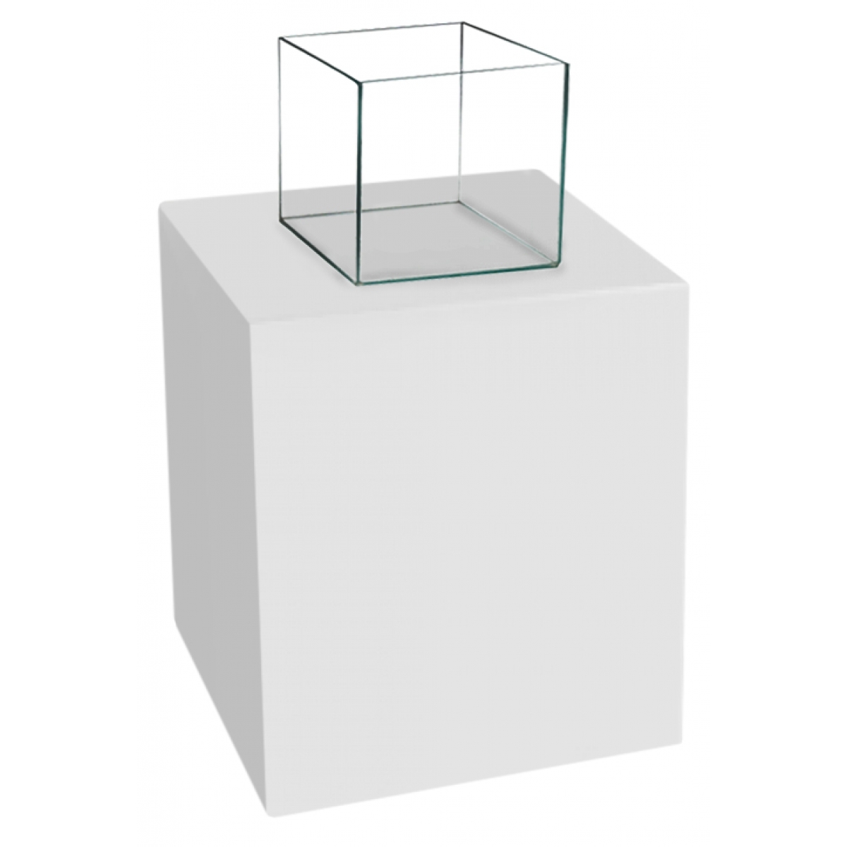 Cubo em madeira branca com redoma de vidro ou acrílico – Estrutura em madeira pintada ou revestida em corino.